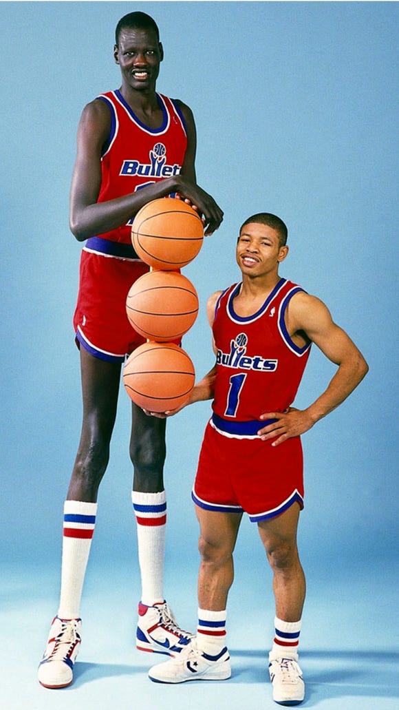 In the 1987-88 season, Manute Bol, who was 7’7” tall, and Muggsy Bogues, who was 5’3”, were teammates on the Washington Bullets. The height difference between them was over 2 feet! Watching them on the court together must’ve been wild.